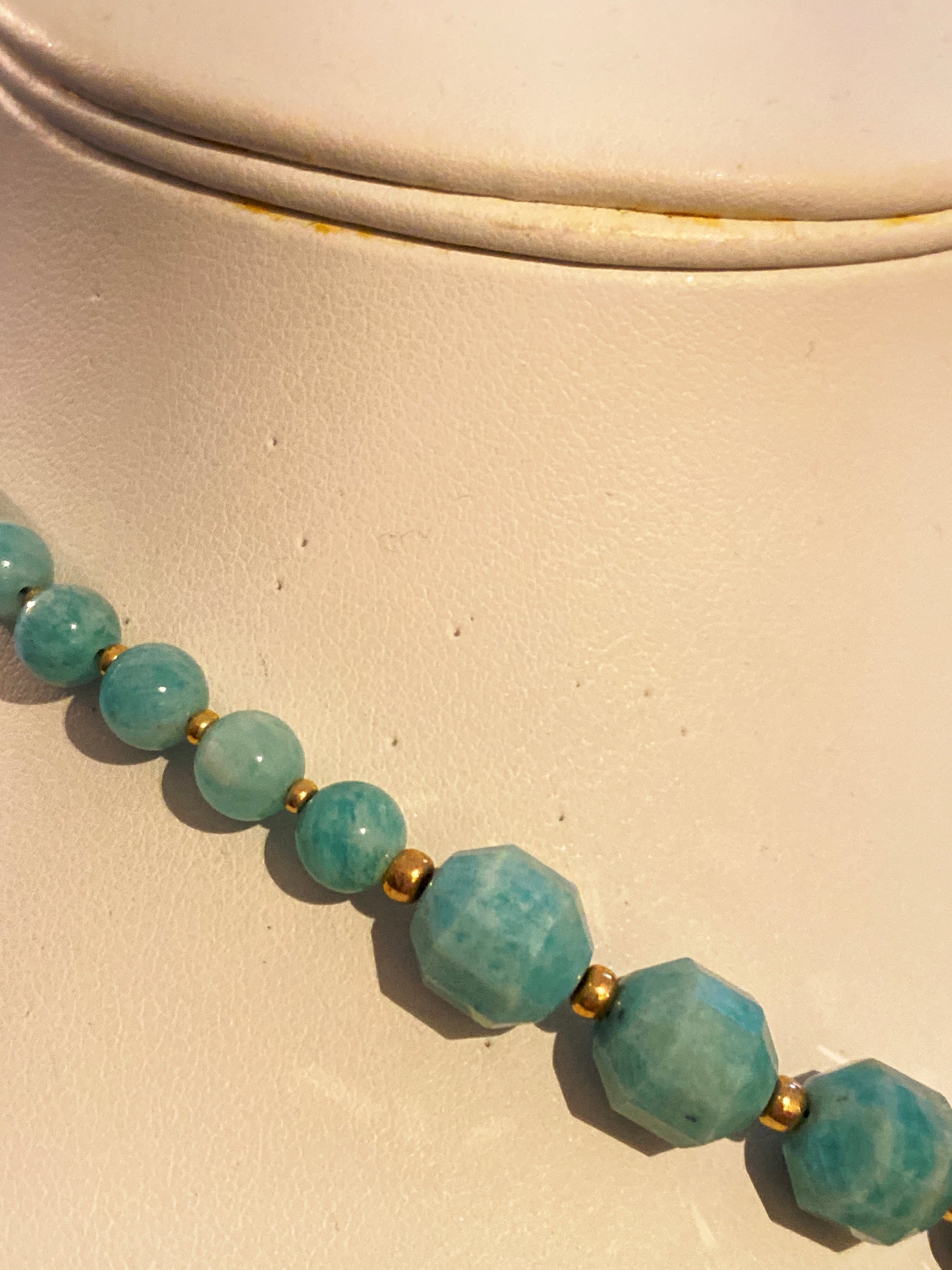 This Amazonite necklace comprises lantern cut beads (10x 9mm}