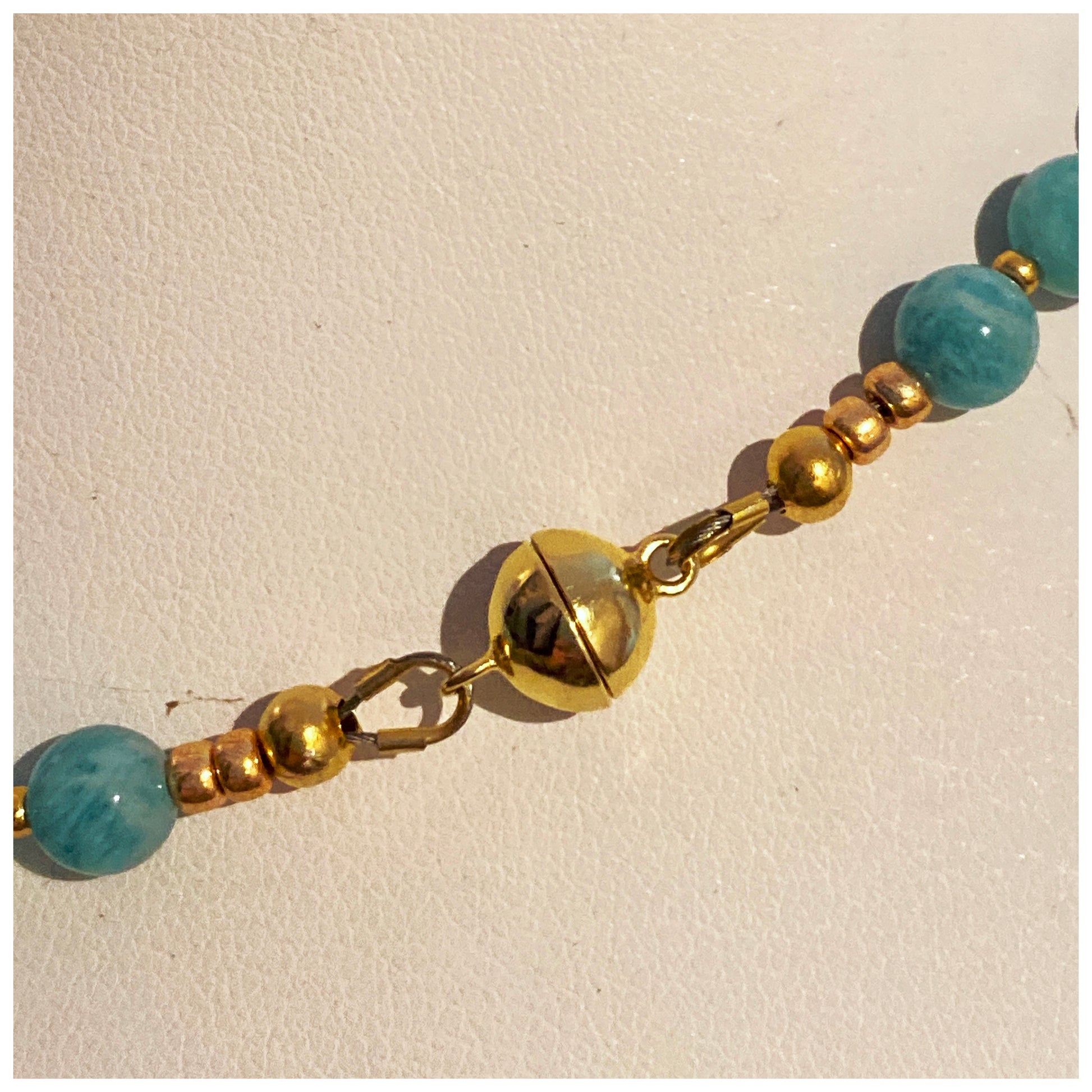 Amazonite in this necklace is a delicate blue / green colour and is translucent showing the inclusions which are a key feature of the stone. It has a crystalline structure which means that it offers a lustrous reflection - an iridescence which enhances all skin tones. The lantern cut beads show this off to perfection. It is another stone which has been unearthed in archaeological digs, and is named for the Amazon river where, legend has it, this was first found.