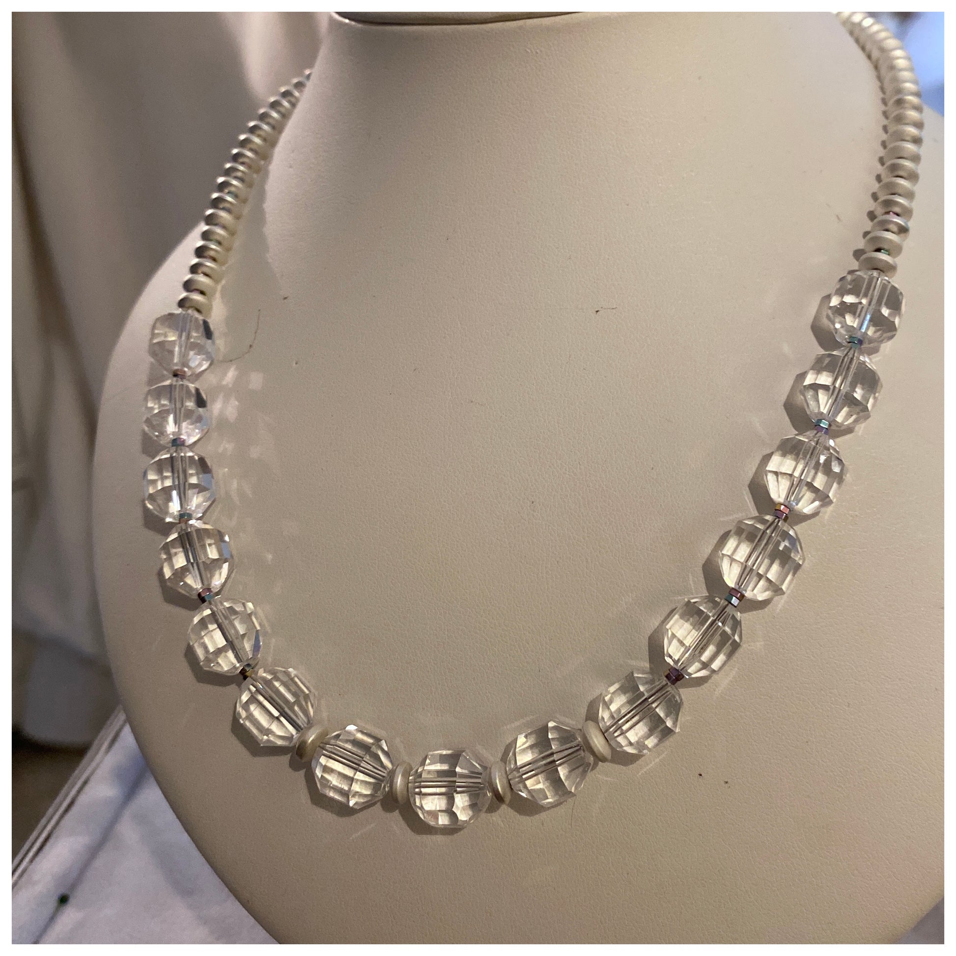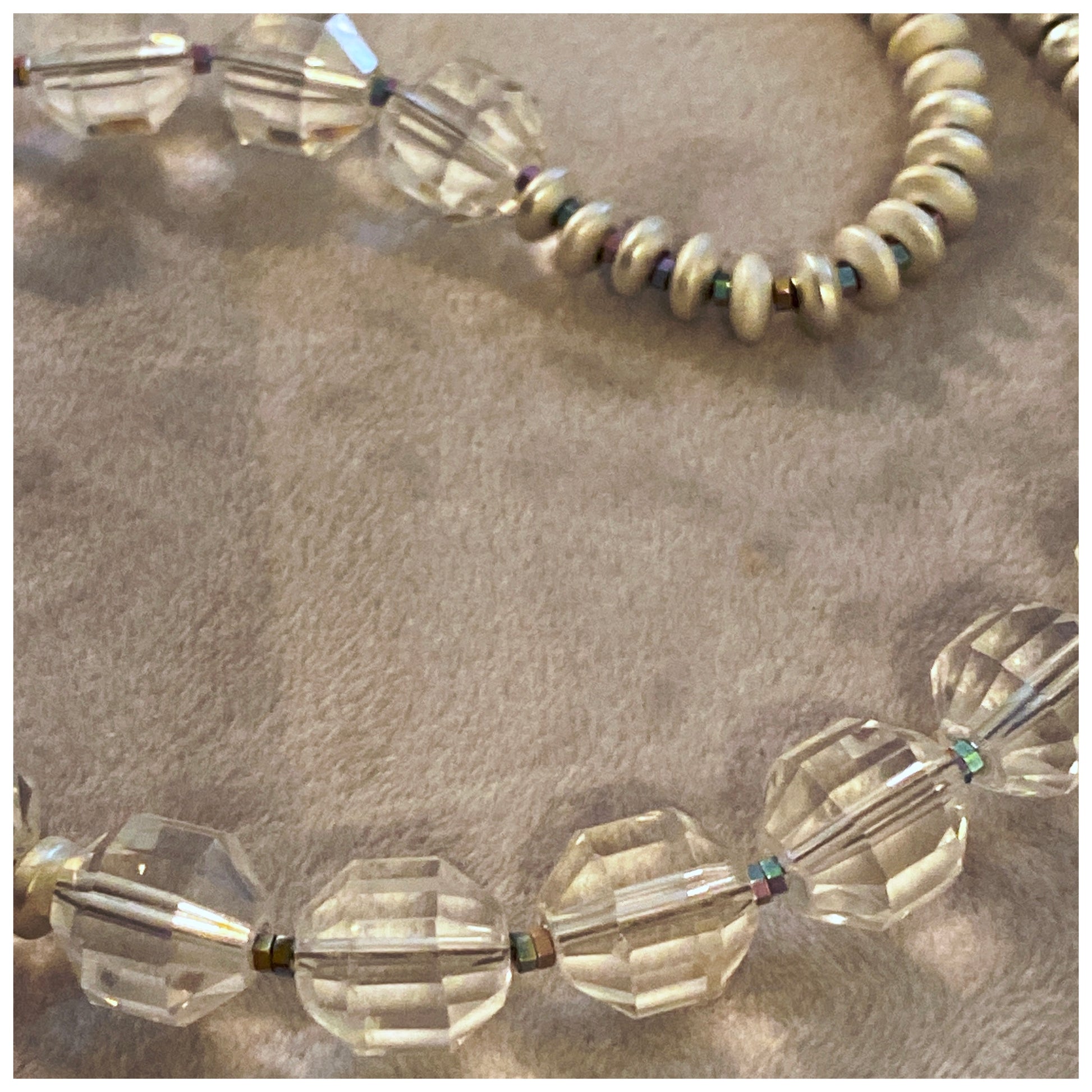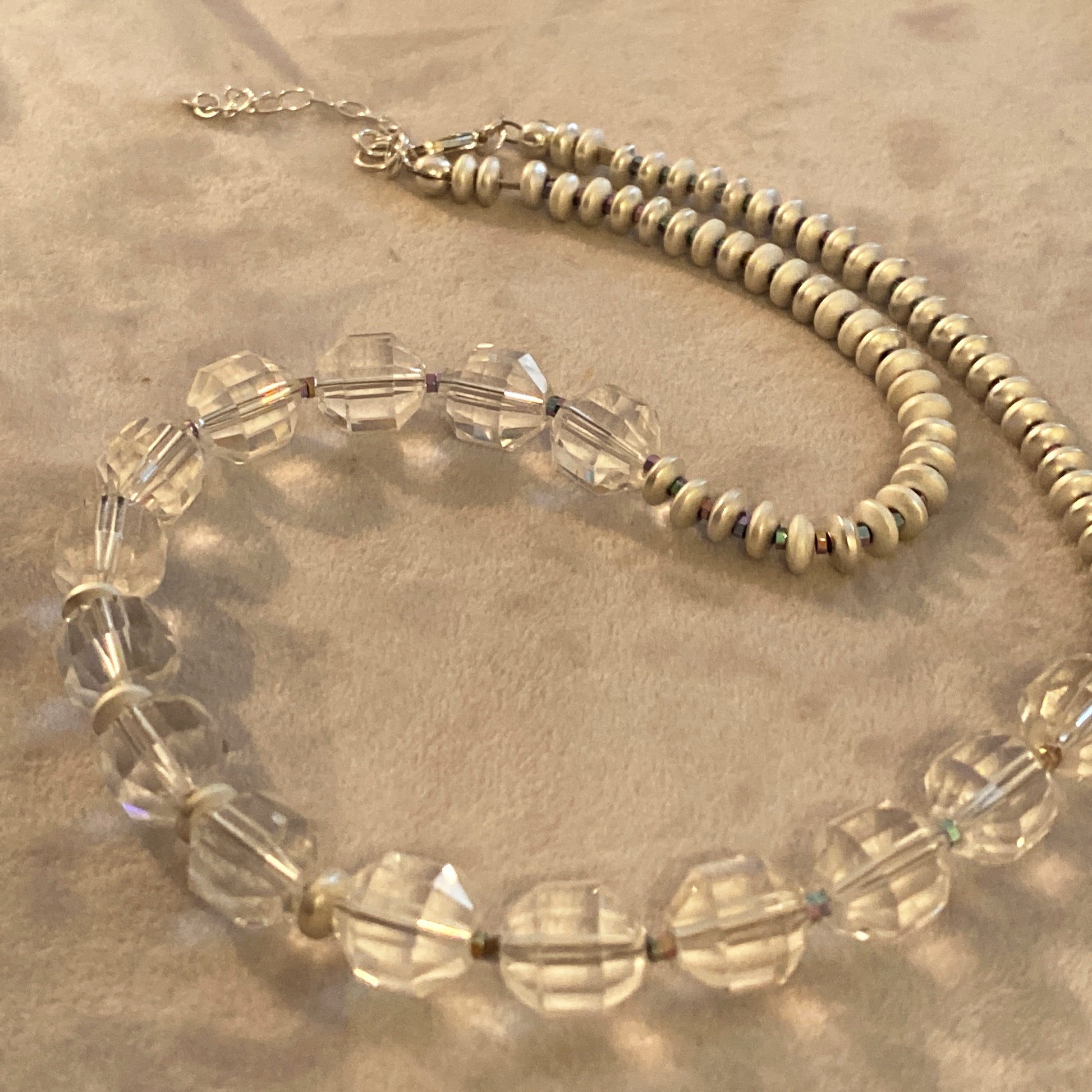 This Crystal Quartz necklaces features sparkling lantern cut Quartz beads with silver coated hematite rondells. The play of light from the crystal quartz is difficult to capture in photos but when worn they truly glisten.