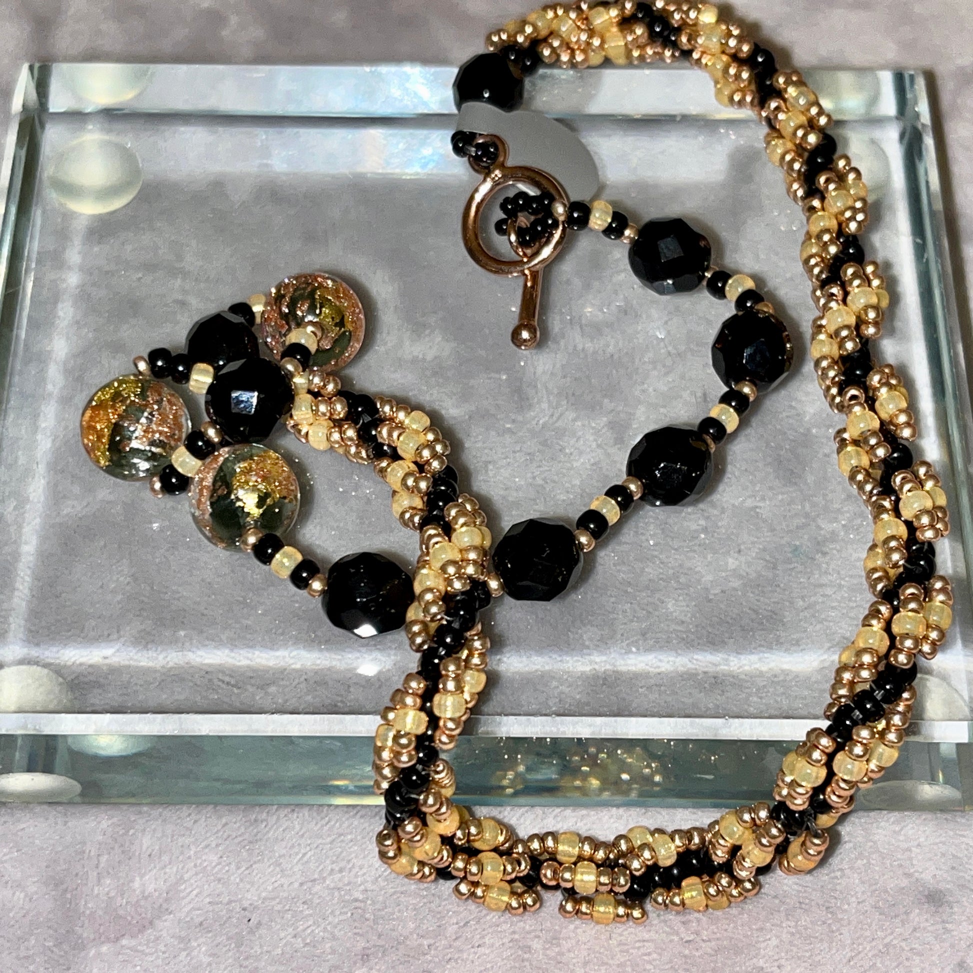 This Necklace features Murano Glass ‘Carlo’ beads with gold and silver leaf, black Czech fire-polished beads and a rose gold plated sterling silver toggle clasp. The Murano Glass beads have each been individually made using traditional glass blowing techniques