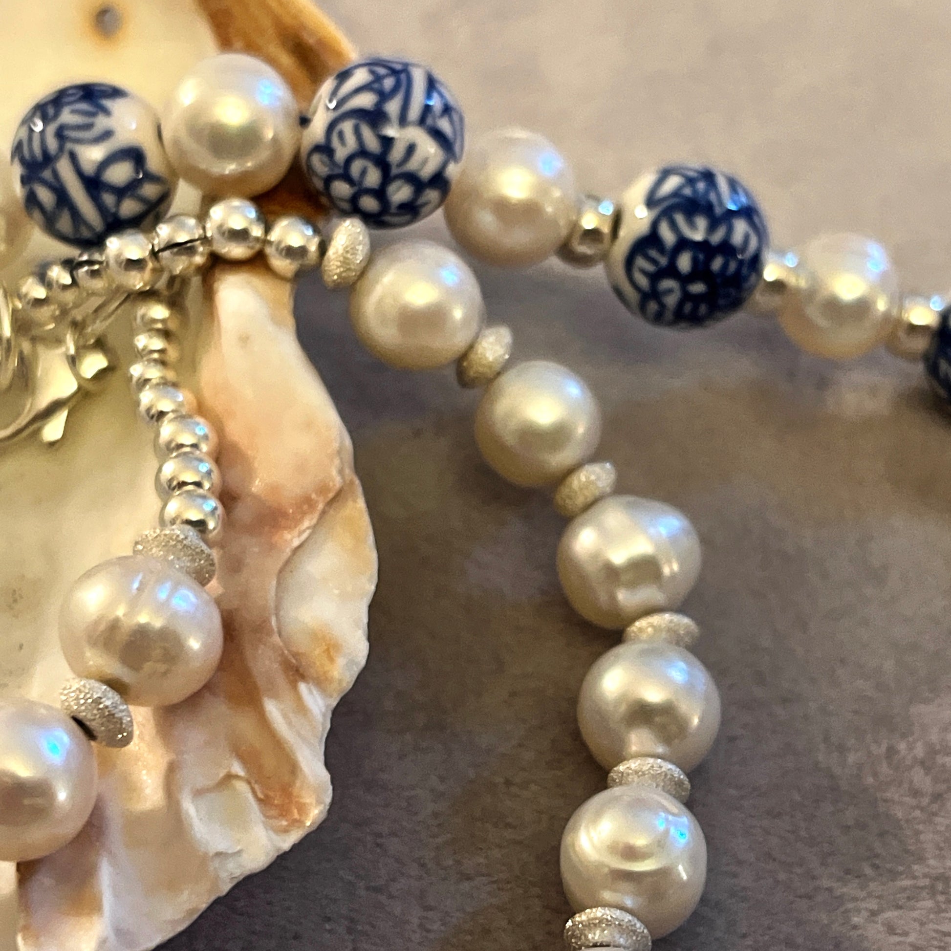 This necklace comprises 8mm white, near-round cultured pearls with 11mm ceramic beads and sterling silver spacer beads. The pearls are very lustrous and are offset by the blue and white of the ceramic beads, and the glow of the silver ones.