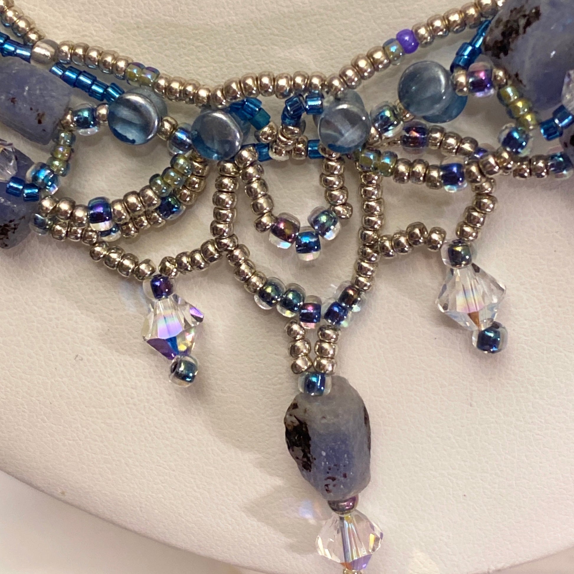 This Intricate necklace offers a vintage look made modern by the use of rough sapphire nuggets. For some added glitter Swarovski crystals are employed alongside seed beads and it is finished sterling silver clasp 20” (52cms) long,